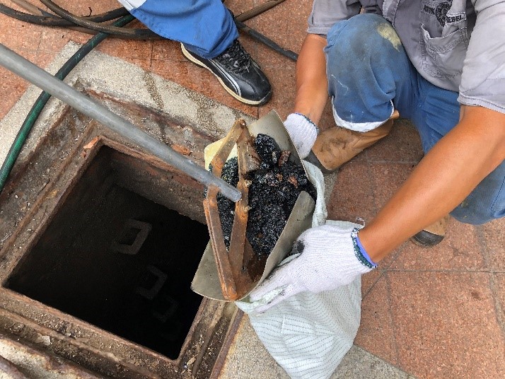 用高壓水機通過壓力喉清洗在管道內碎屑、硬料和油脂沖洗出沙井,用工具將洗出來的 清走,解決渠道倒塞問題。
